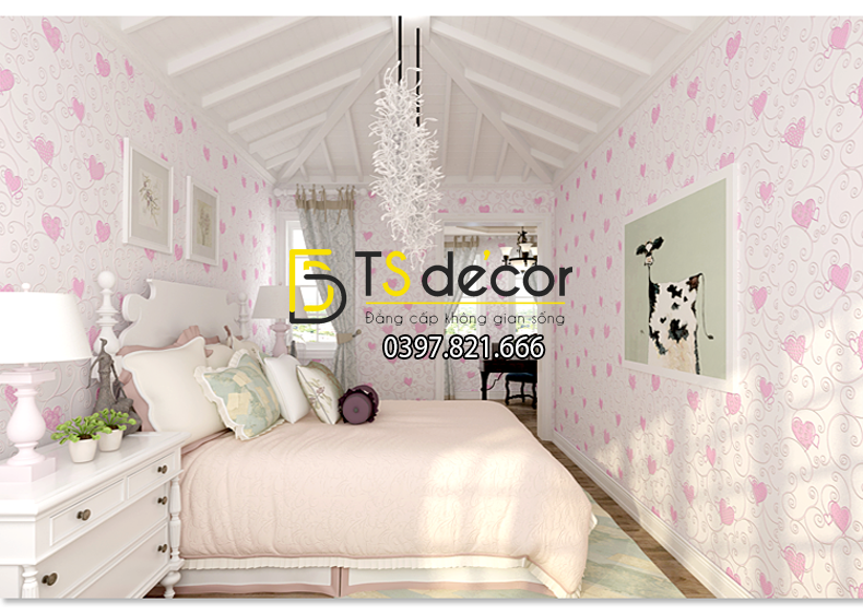 Sử dụng họa tiết trái tim, biểu tượng cho sự lãng mạn trong tình yêu. Cùng với đó là các màu sắc cũng lãng mạn như hồng, xanh, vàng càng làm cho không gian tuyệt hơn. Đặc biệt công nghệ in bề mặt dập nổi tạo ra sự nổi bật cho không gian, tạo chiều sâu. Sau những trái tim yêu là những họa tiết dây uốn lượn gắn kết các trái tim. Với ý nghĩa gắn kết yêu thương.