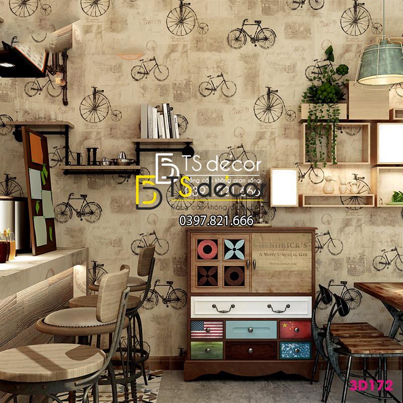 Giấy dán tường họa tiết xe đạp cổ 3D172 trang trí quán bar, shop thời trang. Gam màu nâu trầm hoài cổ, tạo không gian yên bình, tĩnh tại cho quý khách. Nhâm nhi tách trà sống chậm lại trong cuộc sống hối hả.