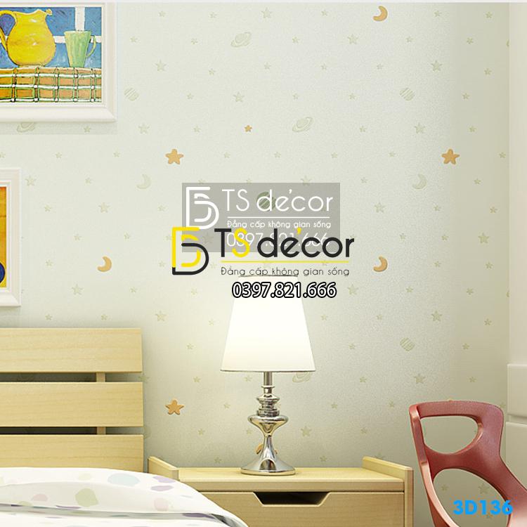 Giấy dán tường trăng sao phòng của bé 3D136. Với các họa tiết trăng, ngôi sao, trái đất quay trên nền các màu nhẹ nhàng phù hợp dán tường phòng bé yêu. Sắp tới quốc tế thiếu nhi 1/6 rồi các mẹ các ba còn chờ gì nữa mà không đặt hàng về trang trí phòng cho bé yêu nhà mình.